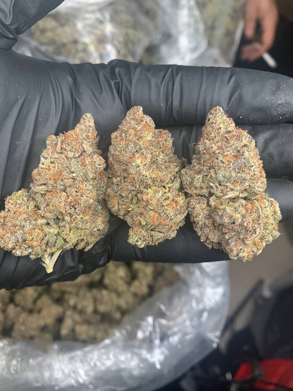 Los cogollos de Grand Daddy Purple en venta son de un verde increíblemente denso que adquiere tonalidades púrpuras profundas a medida que la planta madura, que se extienden por todos los cogollos (no sólo en el exterior). Los pelos de color naranja brillante son abundantes y proporcionan un bonito contraste con los otros colores que adornan los cogollos cubiertos de resina. El olor es simple, y esto puede ser un poco tópico, pero realmente huele a uvas.
